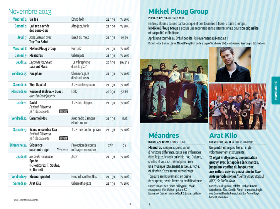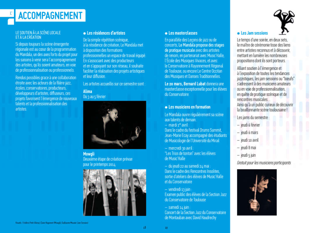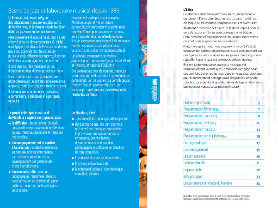 Le Mandala Programme “Saison 2013/14” 1/2 3 1. Couverture Programme. 10×15 cm, impression offset. Photographie : Yann Febvre. 2. Projets de couverture. Photographies : Yann Febvre, Ducasse. 3. Brochure programme. 10×15 cm, 20 pages, impression offset. Voir d’autres projets pour Le Mandala